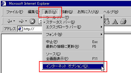 1.InternetExplorerメニューの「表示」を押して、「インターネットオプション」を選択してください。