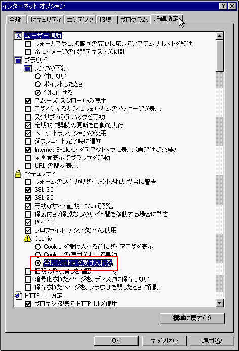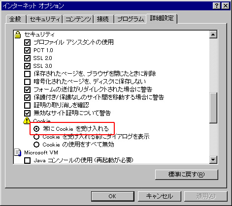 3.「cookie」の項目があります。その中「常にCookieを受け入れる」にチェックしてください。
